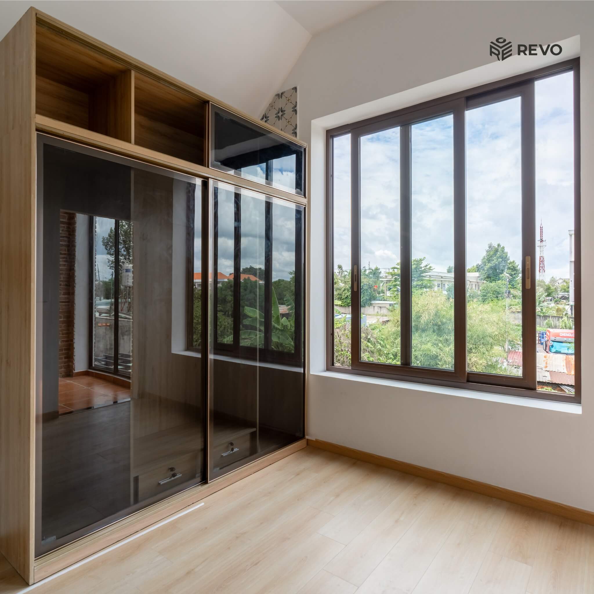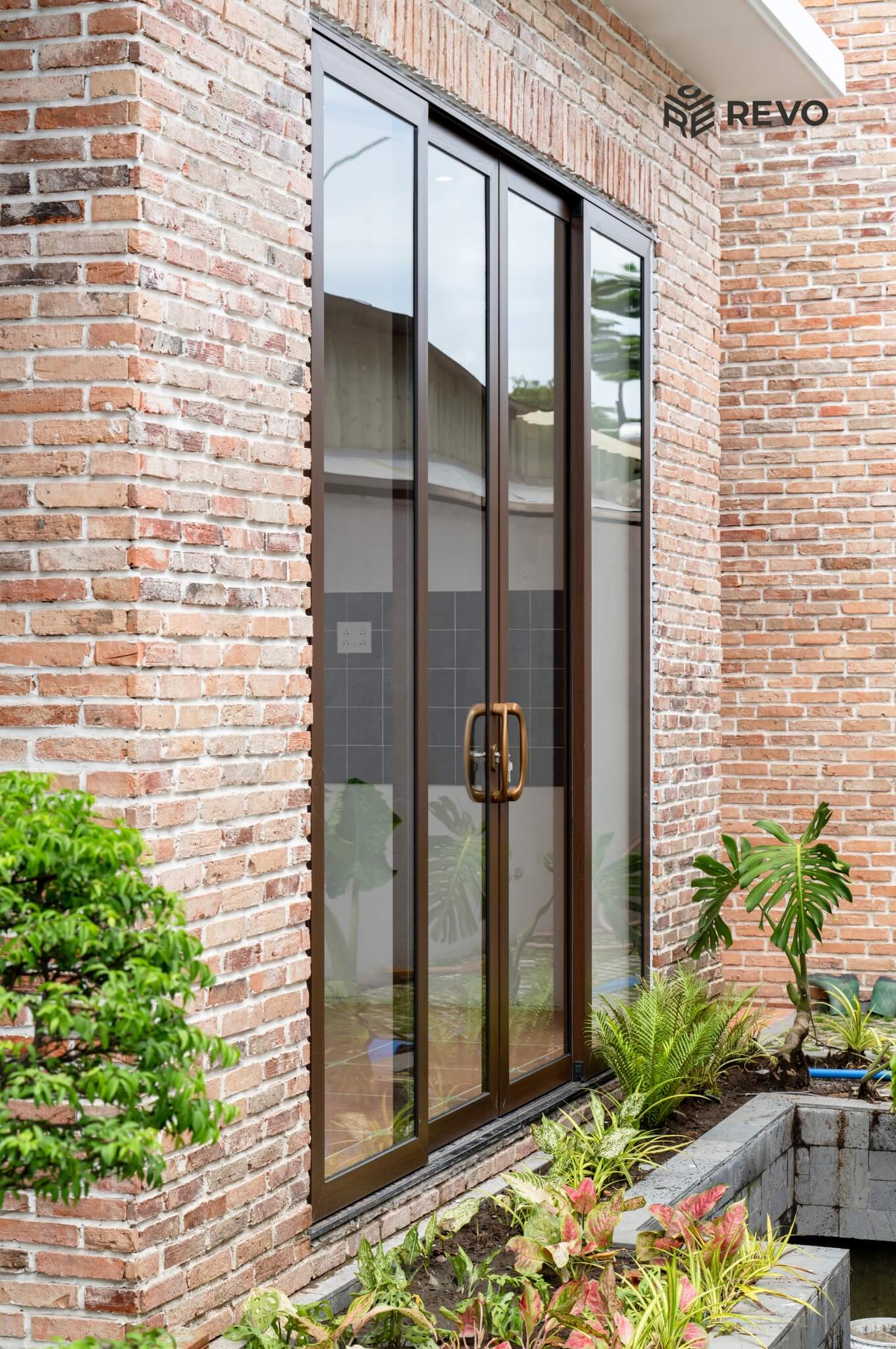 Cửa nhôm REVO màu Gỗ Teak Nâu được lựa chọn như điểm nhấn cân bằng giữa cấu trúc hiện đại và chất liệu tự nhiên. Kết hợp cùng hệ kính fix đón sáng, ánh sáng tự nhiên lan tỏa qua từng khung cửa, tạo nên không gian mềm mại, ấm cúng và mang đậm dấu ấn cá nhân theo tinh thần Bắc Âu đương đại.